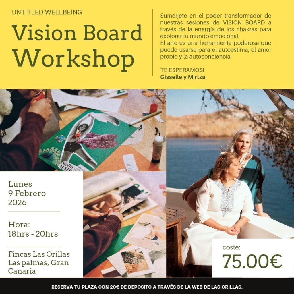 La actividad se desarrolla en tres pasos base: comenzamos con una breve meditación guiada para conectar con tu esencia y la energía del chakra; continuamos con el proceso creativo, donde cada participante da forma a su Vision Board de manera consciente; y cerramos con un espacio de integración y canalización, permitiendo que las imágenes y los elementos elegidos se anclen con claridad e intención.